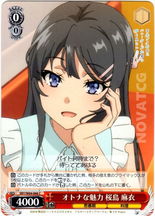 [A] When this card is played from hand to stage, if the opponent has 5 or more climaxes in the waiting room, Rest this card.