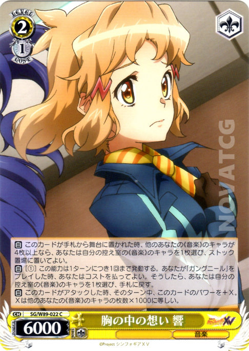 [A] – When this card is placed on Stage from Hand, if you have four or more other《Music》Characters, choose one《Music》Character in your Waiting Room, send it to Stock.