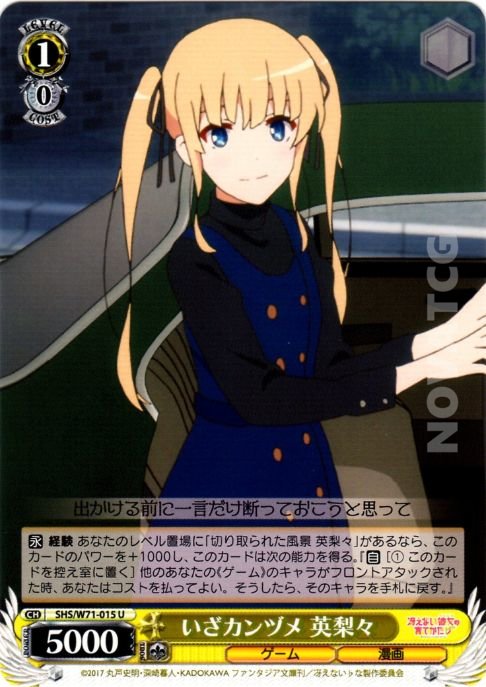 【永】 経験 あなたのレベル置場に「切り取られた風景 英梨々」があるなら、このカードのパワーを+1000し、このカードは次の能力を得る。『【自】[(1) このカードを控え室に置く] 他のあなたの《ゲーム》のキャラがフロントアタックされた時、あなたはコストを払ってよい。そうしたら、そのキャラを手札に戻す。』