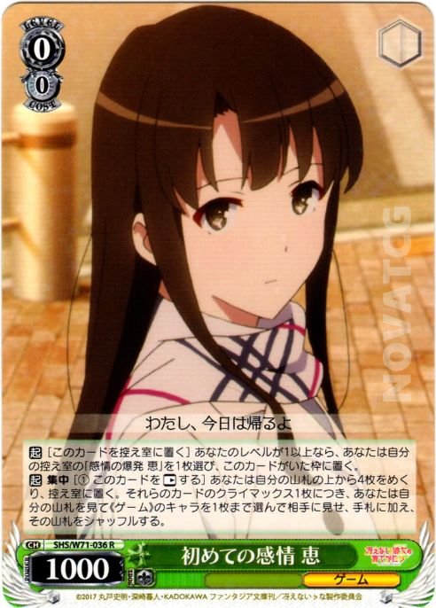 【起】[このカードを控え室に置く] あなたのレベルが1以上なら、あなたは自分の控え室の「感情の爆発 恵」を1枚選び、このカードがいた枠に置く。