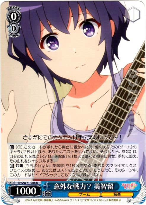【自】[(1)] このカードが手札から舞台に置かれた時、他のあなたの《ゲーム》のキャラが2枚以上なら、あなたはコストを払ってよい。そうしたら、あなたは自分の山札を見て「icy tail 美智留」を1枚まで選んで相手に見せ、手札に加え、その山札をシャッフルする。