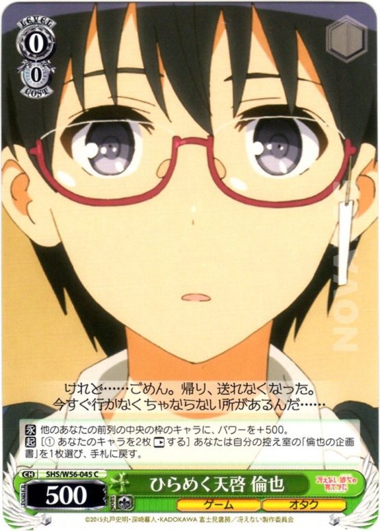【起】[(1) あなたのキャラを2枚【レスト】する] あなたは自分の控え室の「倫也の企画書」を1枚選び、手札に戻す。