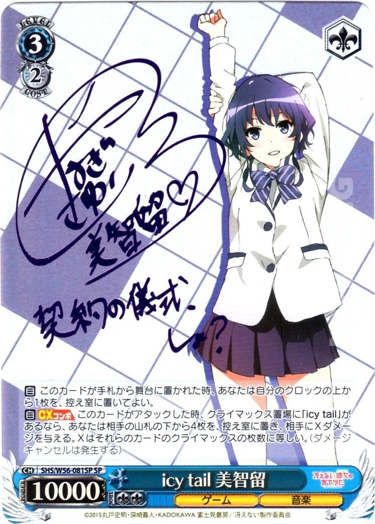 [A]【CXCombo】 When this card attacks, if 「icy tail」 is in the climax slot, take the bottom 4 cards of your opponent’s deck, place it in the waiting room, the opponent takes X damage. X is the amount of climaxes. (damage can be cancelled)
