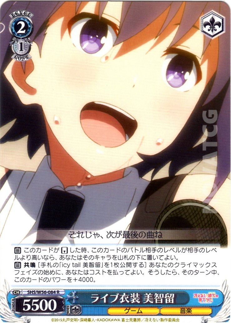 【自】 共鳴 [手札の「icy tail 美智留」を1枚公開する] あなたのクライマックスフェイズの始めに、あなたはコストを払ってよい。そうしたら、そのターン中、このカードのパワーを+4000。