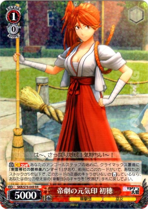 【自】【CXコンボ】 あなたのアンコールステップの始めに、クライマックス置場に「東雲神社の御神楽ハンマー!」があり、前列にこのカードがいて、あなたのストックが5枚以下で、このカードの正面のキャラがいないか【リバース】しているなら、あなたは自分の控え室の《華撃団》のキャラを1枚選び、手札に戻してよい。