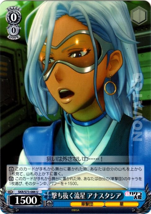 【自】 このカードが手札から舞台に置かれた時、あなたは自分の《華撃団》のキャラを1枚選び、そのターン中、パワーを+1500。