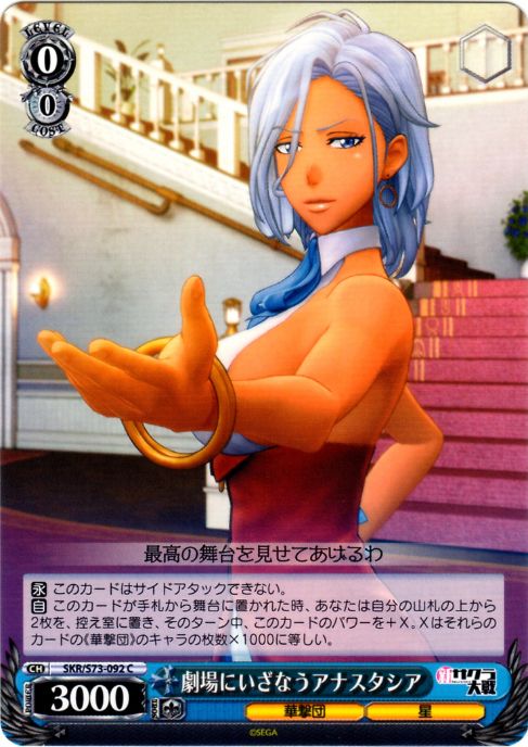 【自】 このカードが手札から舞台に置かれた時、あなたは自分の山札の上から2枚を、控え室に置き、そのターン中、このカードのパワーを+X。Xはそれらのカードの《華撃団》のキャラの枚数×1000に等しい。