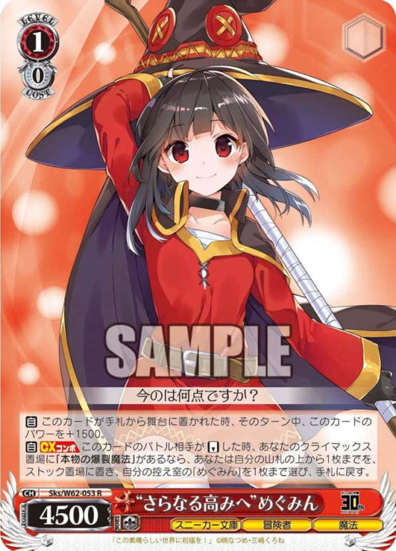 【自】【CXコンボ】 このカードのバトル相手が【リバース】した時、あなたのクライマックス置場に「本物の爆裂魔法」があるなら、あなたは自分の山札の上から1枚までを、ストック置場に置き、自分の控え室の「めぐみん」を1枚まで選び、手札に戻す。