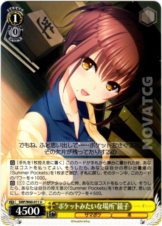 【自】[(1)] このカードがアタックした時、あなたはコストを払ってよい。そうしたら、あなたは自分の控え室の「Summer Pockets」を1枚まで選び、思い出にし、そのターン中、このカードのパワーを+500。