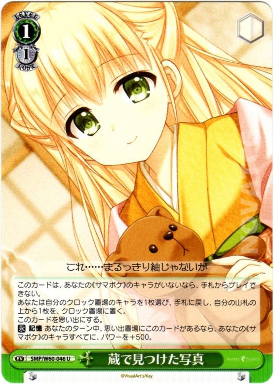 【永】 記憶 あなたのターン中、思い出置場にこのカードがあるなら、あなたの《サマポケ》のキャラすべてに、パワーを+500。