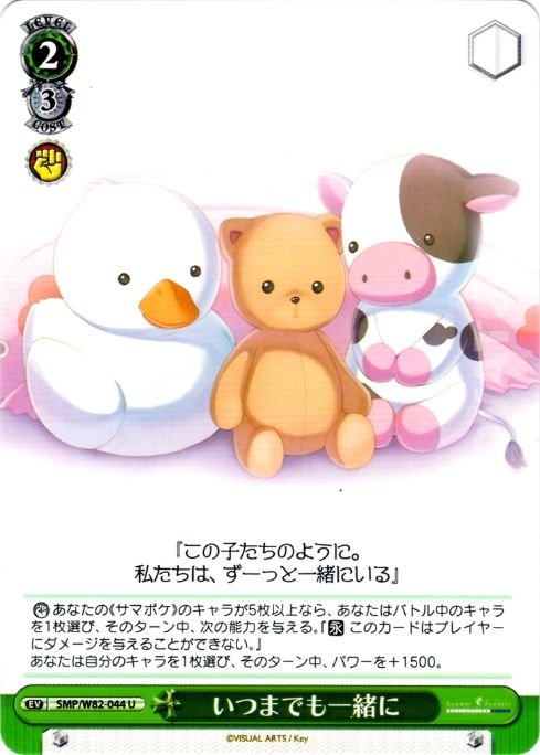 【カウンター】 あなたの《サマポケ》のキャラが5枚以上なら、あなたはバトル中のキャラを1枚選び、そのターン中、次の能力を与える。『【永】 このカードはプレイヤーにダメージを与えることができない。』