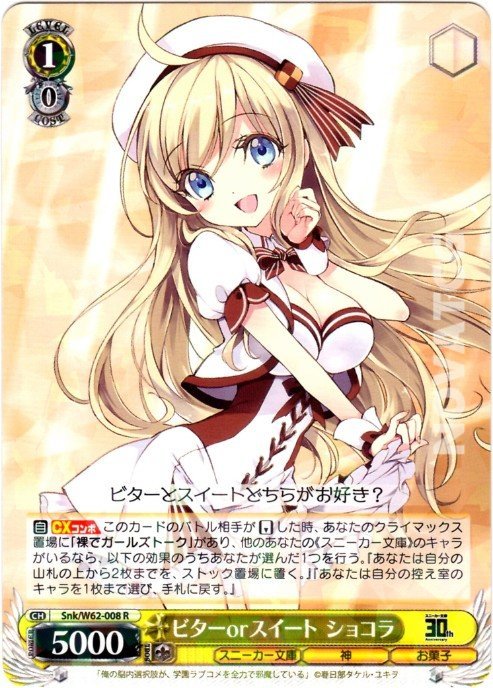 【自】【CXコンボ】 このカードのバトル相手が【リバース】した時、あなたのクライマックス置場に「裸でガールズトーク」があり、他のあなたの《スニーカー文庫》のキャラがいるなら、以下の効果のうちあなたが選んだ1つを行う。『あなたは自分の山札の上から2枚までを、ストック置場に置く。』『あなたは自分の控え室のキャラを1枚まで選び、手札に戻す。』