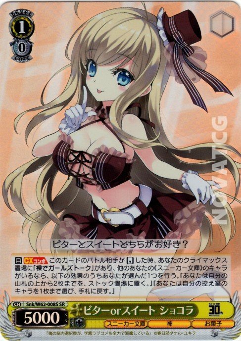 【自】【CXコンボ】 このカードのバトル相手が【リバース】した時、あなたのクライマックス置場に「裸でガールズトーク」があり、他のあなたの《スニーカー文庫》のキャラがいるなら、以下の効果のうちあなたが選んだ1つを行う。『あなたは自分の山札の上から2枚までを、ストック置場に置く。』『あなたは自分の控え室のキャラを1枚まで選び、手札に戻す。』