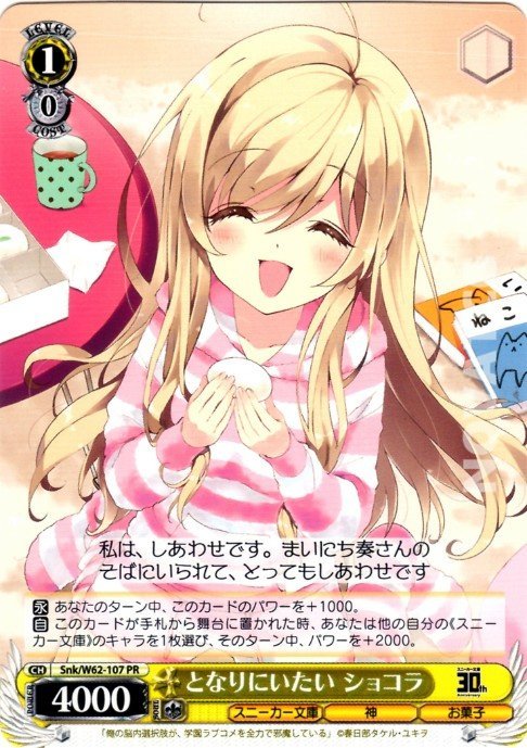 【自】 このカードが手札から舞台に置かれた時、あなたは他の自分の《スニーカー文庫》のキャラを1枚選び、そのターン中、パワーを+2000。