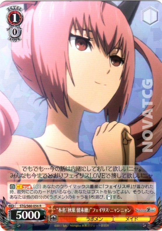 【自】【CXコンボ】[(1)] あなたのクライマックス置場に「フェイリス杯」が置かれた時、前列にこのカードがいるなら、あなたはコストを払ってよい。そうしたら、あなたは他の自分の《ラボメン》のキャラを1枚選び、【スタンド】する。
