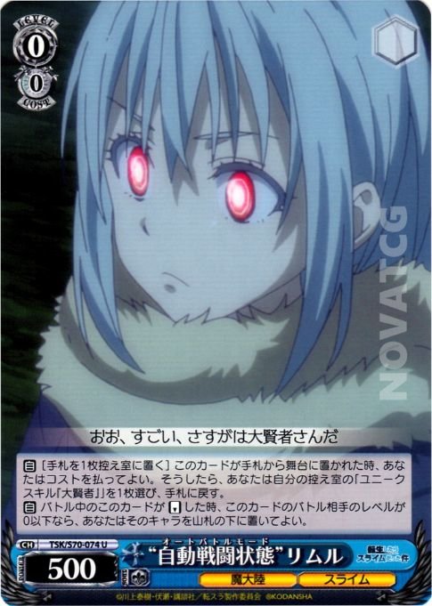 【自】[手札を1枚控え室に置く] このカードが手札から舞台に置かれた時、あなたはコストを払ってよい。そうしたら、あなたは自分の控え室の「ユニークスキル『大賢者』」を1枚選び、手札に戻す。