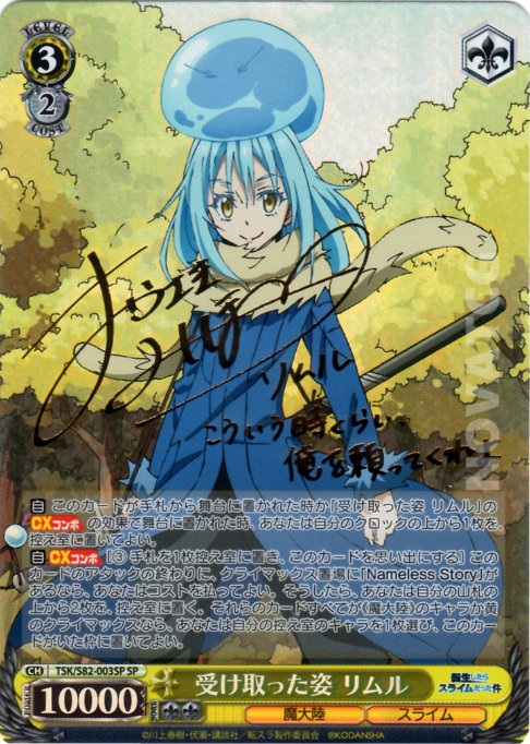 【自】 このカードが手札から舞台に置かれた時か「受け取った姿 リムル」の【CXコンボ】の効果で舞台に置かれた時、あなたは自分のクロックの上から1枚を、控え室に置いてよい。