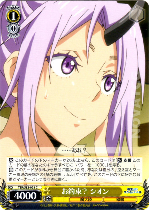 【自】 このカードが手札から舞台に置かれた時、あなたは自分の、控え室とマーカー置場の表向きの「命の危機 リムル」すべてを、このカードの下に好きな順番でマーカーとして表向きに置く。