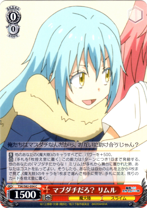 【自】[手札を1枚控え室に置く] この能力は1ターンにつき1回まで発動する。他のあなたの「マブダチだからな! ミリム」が手札から舞台に置かれた時、あなたはコストを払ってよい。そうしたら、あなたは自分の山札を上から4枚まで見て、《魔大陸》のキャラを1枚まで選んで相手に見せ、手札に加え、残りのカードを控え室に置く。