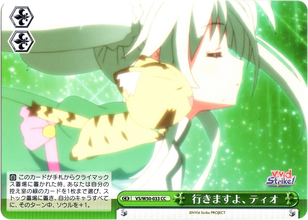 【自】 このカードが手札からクライマックス置場に置かれた時、あなたは自分の控え室の緑のカードを1枚まで選び、ストック置場に置き、自分のキャラすべてに、そのターン中、ソウルを+1。