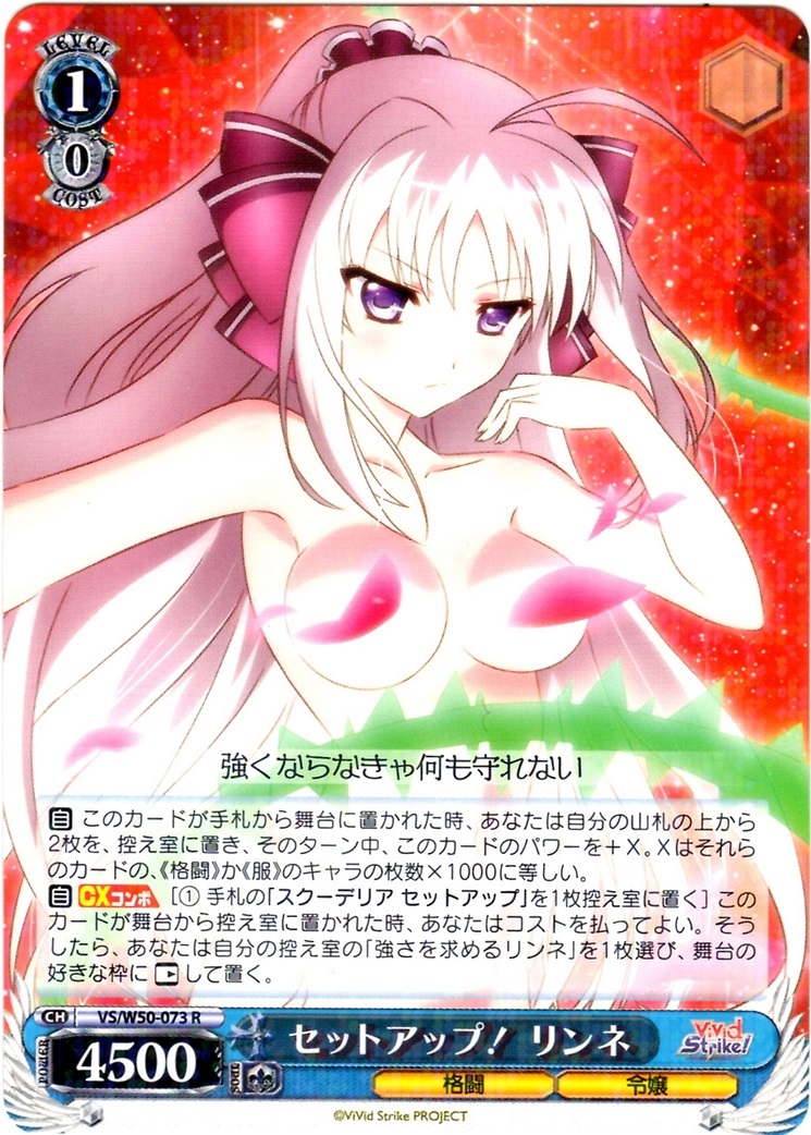 【自】【CXコンボ】[(1) 手札の「スクーデリア セットアップ」を1枚控え室に置く] このカードが舞台から控え室に置かれた時、あなたはコストを払ってよい。そうしたら、あなたは自分の控え室の「強さを求めるリンネ」を1枚選び、舞台の好きな枠に【レスト】して置く。
