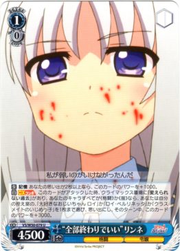 【自】[あなたの舞台のカード名に「リンネ」を含むキャラを1枚クロック置場に置き、このカードを思い出にする] このカードが手札から舞台に置かれた時、あなたはコストを払ってよい。そうしたら、あなたは自分の山札を見て「“全部終わりでいい”リンネ」を1枚まで選び、舞台の好きな枠に置く。その後、その山札をシャッフルし、次の相手のターンの終わりまで、そのキャラのパワーを+1500。