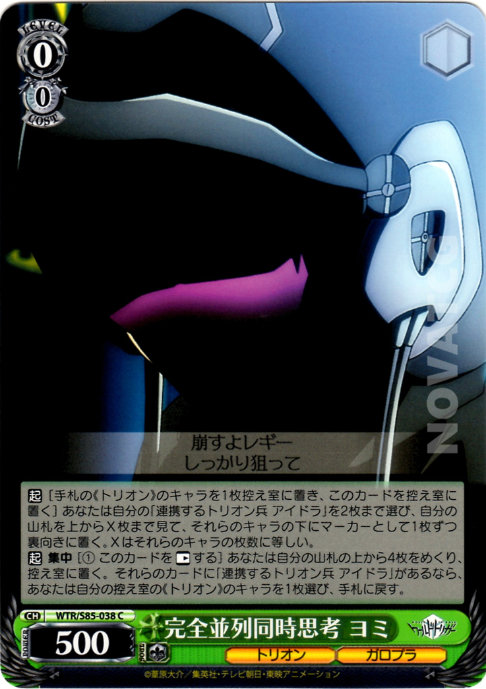 [S] – BRAINSTORM [(1) Rest this] Flip over the top four cards of your deck, then send them to Waiting Room. If there is a [連携するトリオン兵 アイドラ] among them, choose up to one «Trion» Character in your Waiting Room, add it to Hand.