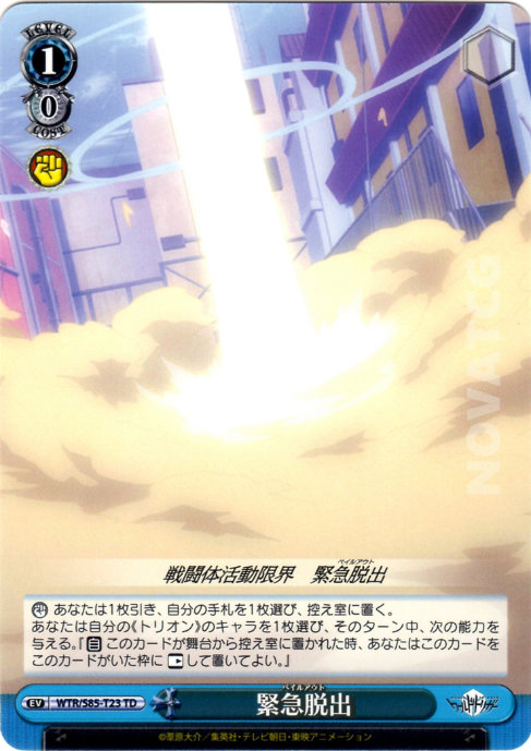 あなたは自分の《トリオン》のキャラを1枚選び、そのターン中、次の能力を与える。『【自】 このカードが舞台から控え室に置かれた時、あなたはこのカードをこのカードがいた枠に【レスト】して置いてよい。』