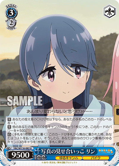 【永】 他のあなたの後列の《ゆるキャン△》のキャラ1枚につき、このカードのパワーを+500。