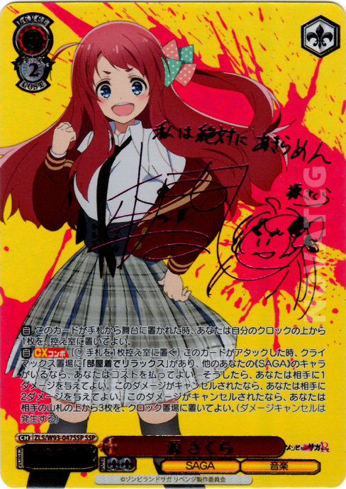 [A] – [(1) Send one card from Hand to Waiting Room] When this card attacks, if you have [部屋着でリラックス] in your Climax Zone, if you have another «SAGA» Character, you may pay the cost. If you did, deal one damage to your opponent. If that damage is cancelled, you may deal two damage to your opponent. If that damage is cancelled, you send the top three cards of your opponent’s Deck to Clock. (Damage can be cancelled)