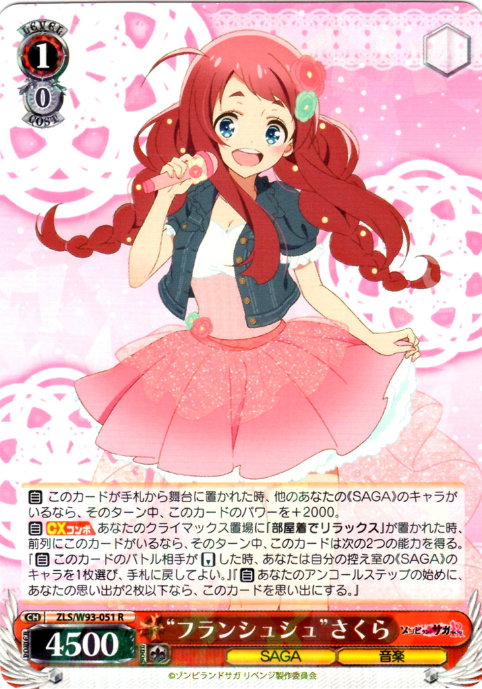 【自】【CXコンボ】 あなたのクライマックス置場に「部屋着でリラックス」が置かれた時、前列にこのカードがいるなら、そのターン中、このカードは次の2つの能力を得る。『【自】 このカードのバトル相手が【リバース】した時、あなたは自分の控え室の《SAGA》のキャラを1枚選び、手札に戻してよい。』『【自】 あなたのアンコールステップの始めに、あなたの思い出が2枚以下なら、このカードを思い出にする。』
