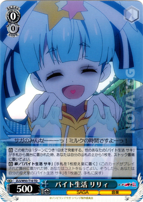[A] – This effect activates up to once per turn. When your other [バイト生活 サキ] is placed on Stage from Hand, you may send the top card of your Deck to Stock.