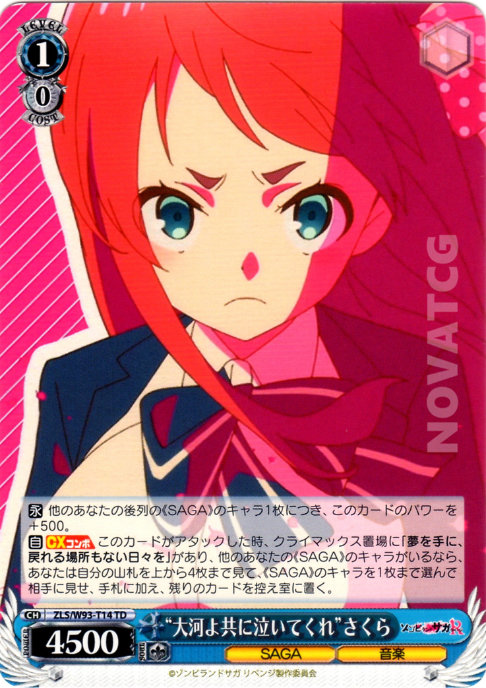 [A] – When this card attacks, if you have [夢を手に、戻れる場所もない日々を] in your Climax Zone, if you have another «SAGA» Character, look at up to four cards from the top of your Deck, choose up to one «SAGA» Character among them, show it to your opponent, add it to Hand, send the remaining cards to Waiting Room.